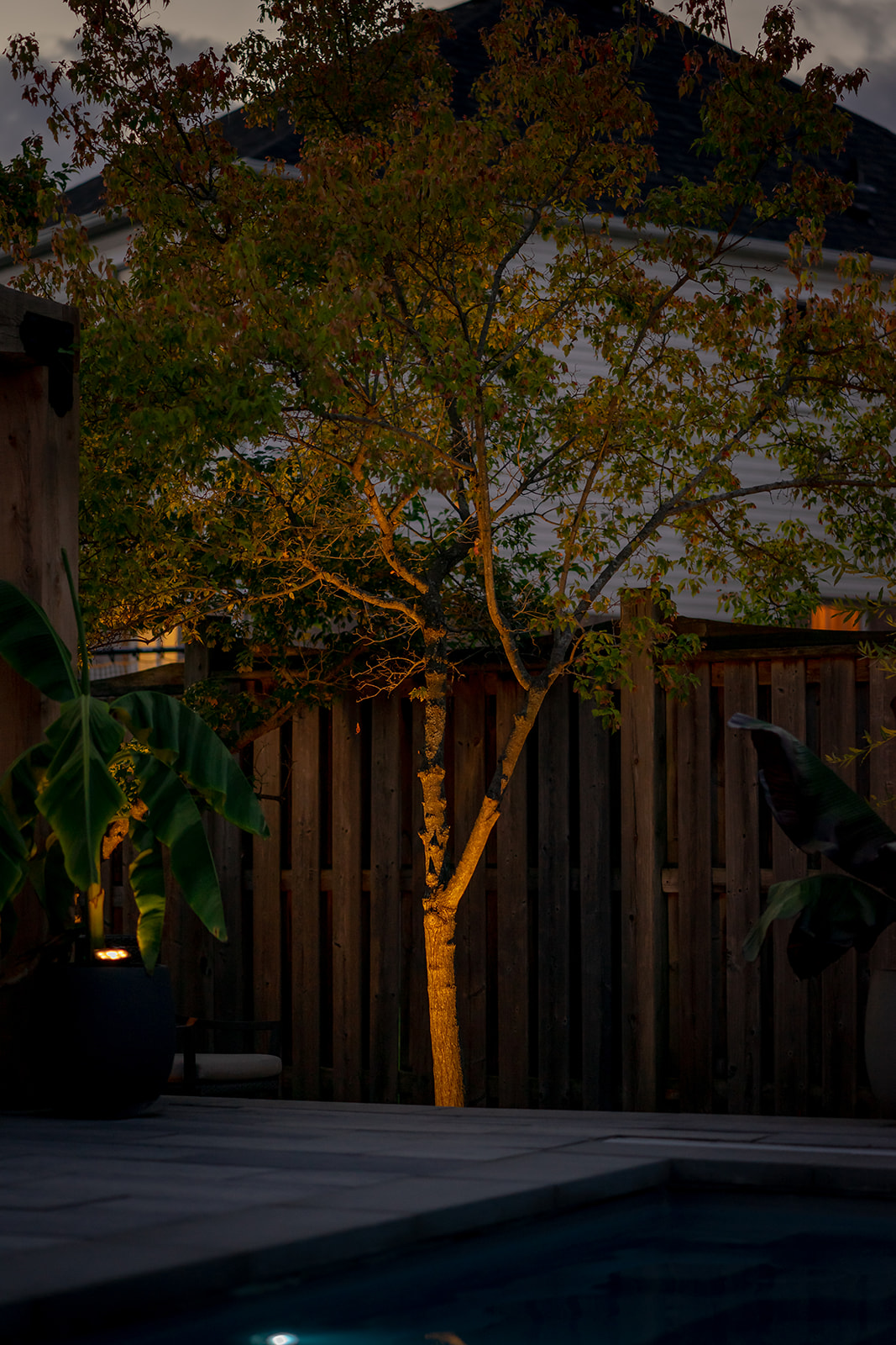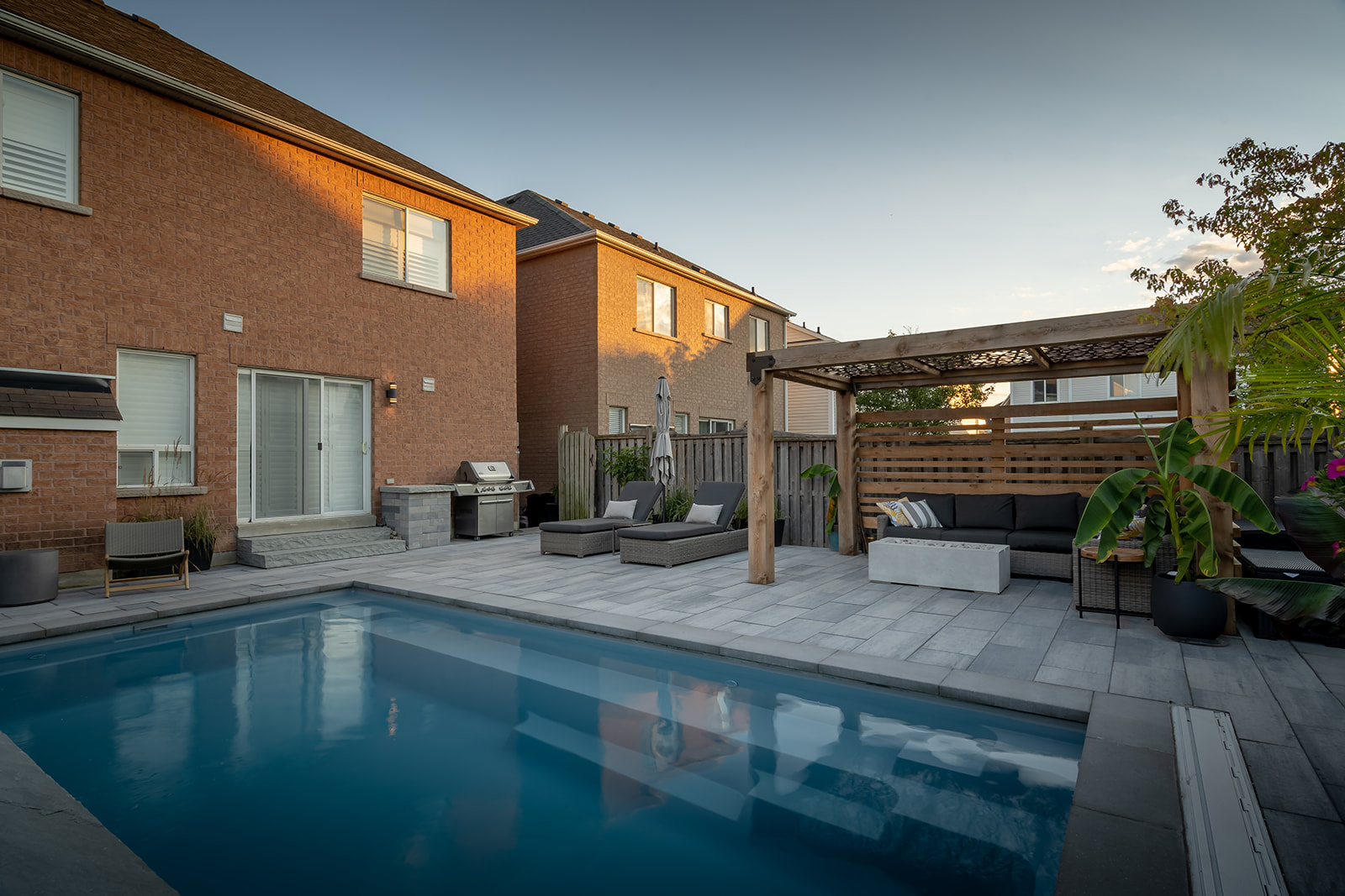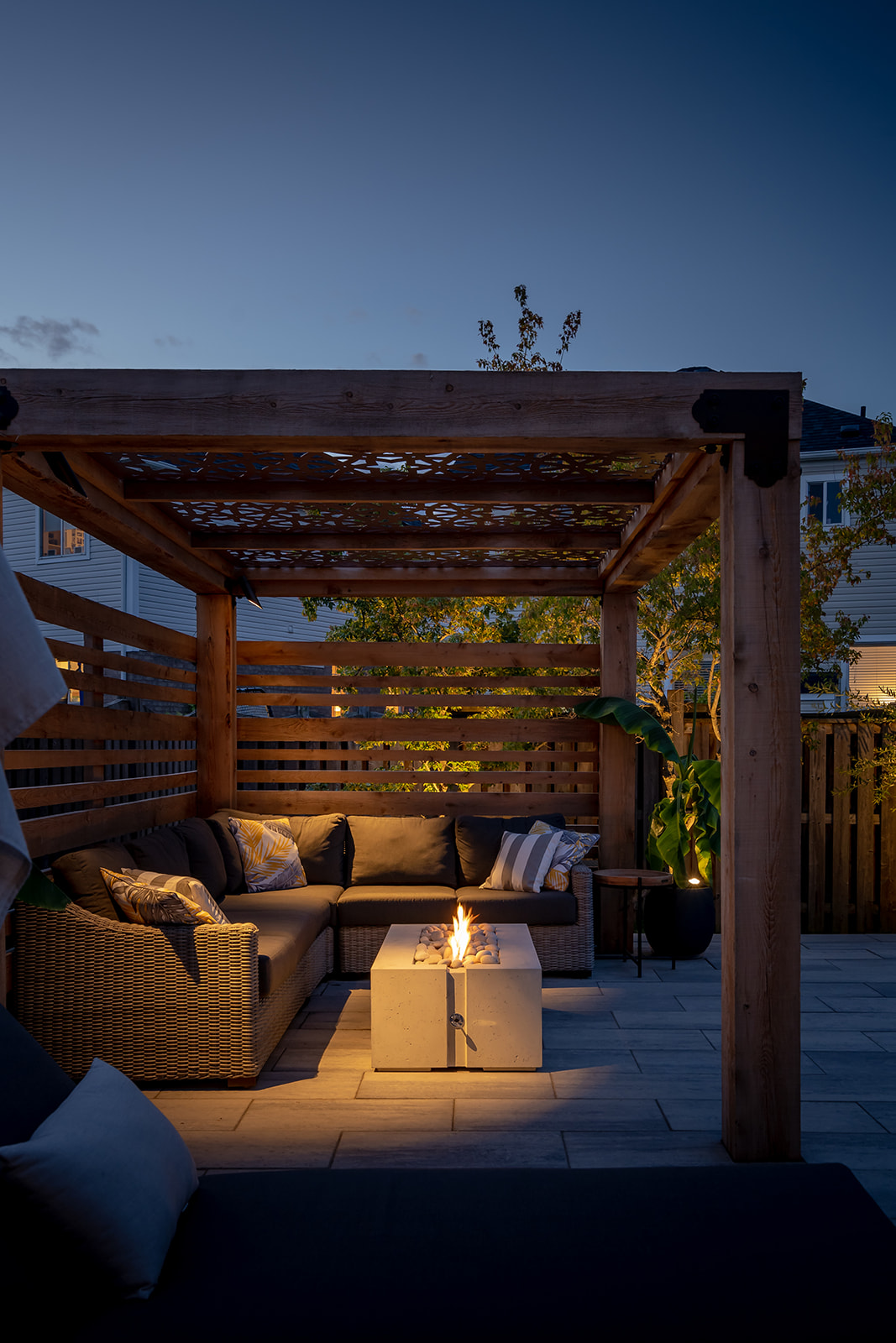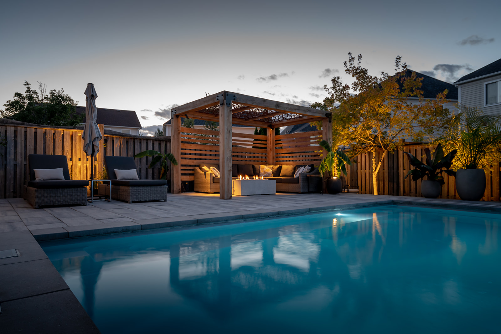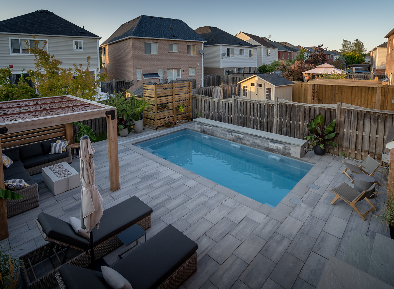 The Moynahan backyard project makes great use of a tight space. Designed to be low-maintenance, this project features a large patio, pergola, fire pit, pool, and water features. The addition of large-leaf plants in pots around the perimeter of this space provide a beautiful splash of green while maintaining the low-maintenance intent of the design.