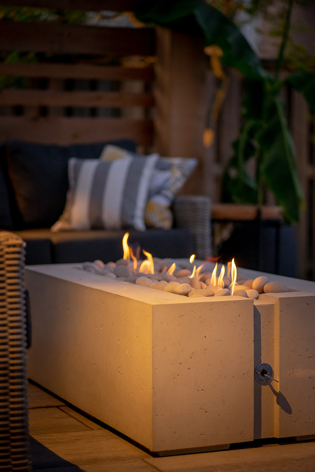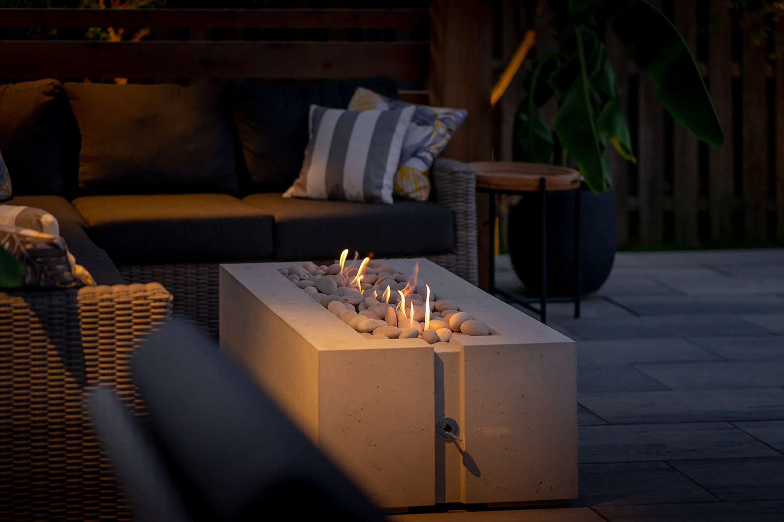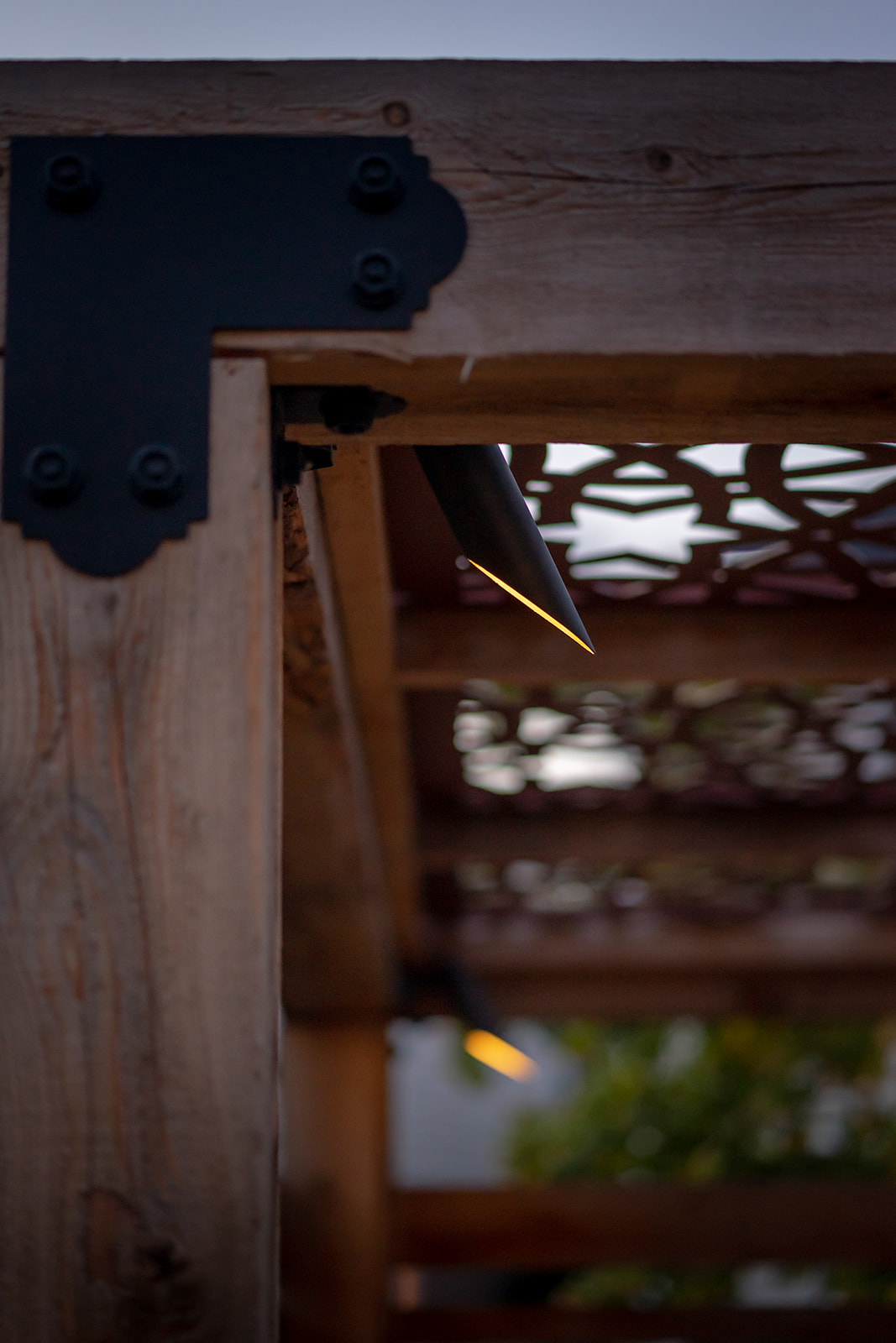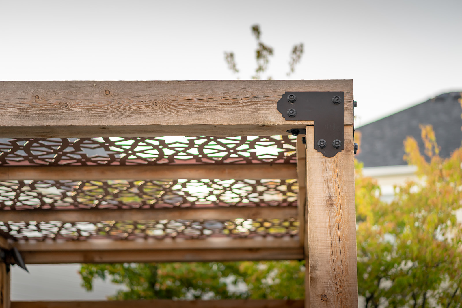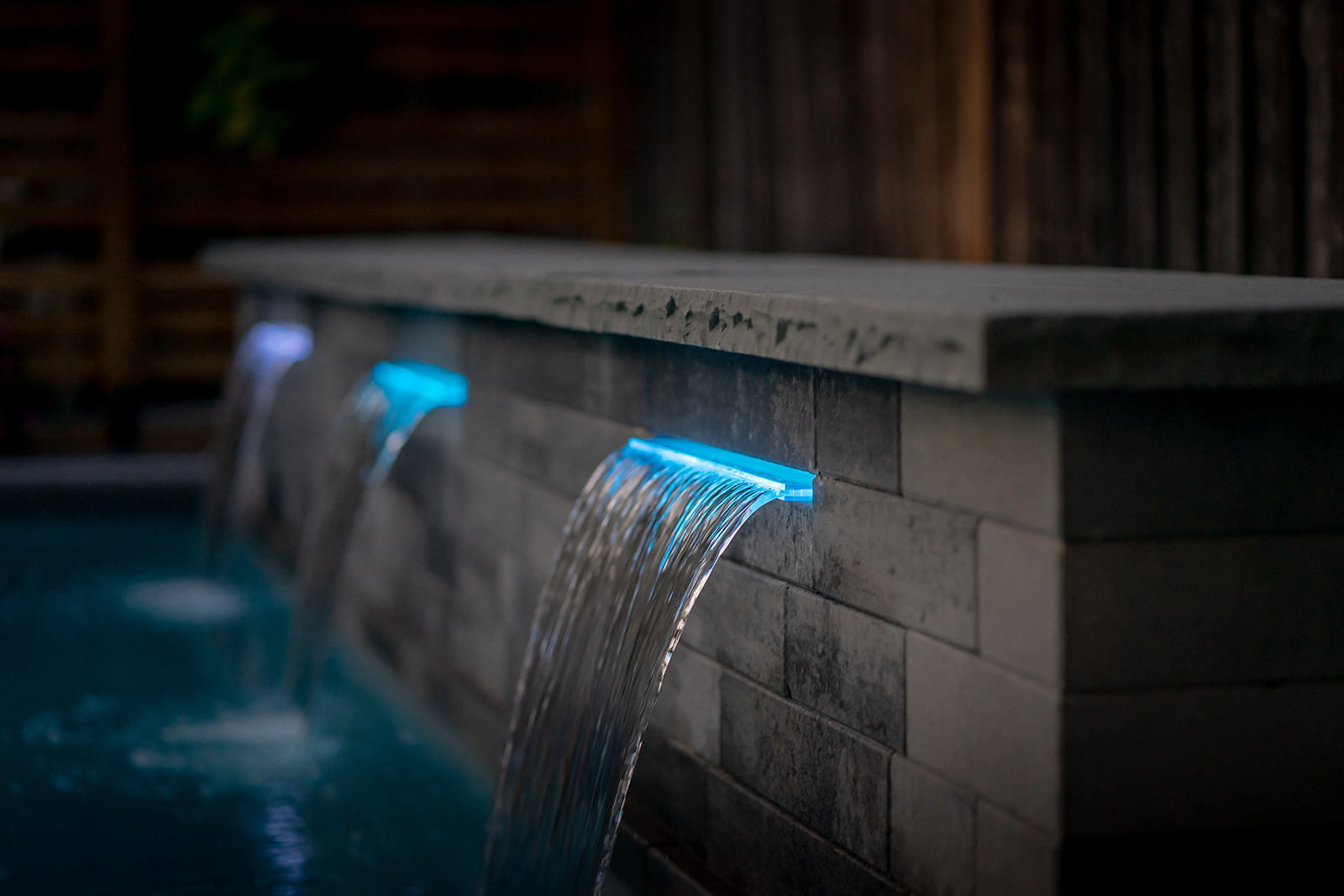 The Moynahan backyard project makes great use of a tight space. Designed to be low-maintenance, this project features a large patio, pergola, fire pit, pool, and water features. The addition of large-leaf plants in pots around the perimeter of this space provide a beautiful splash of green while maintaining the low-maintenance intent of the design.